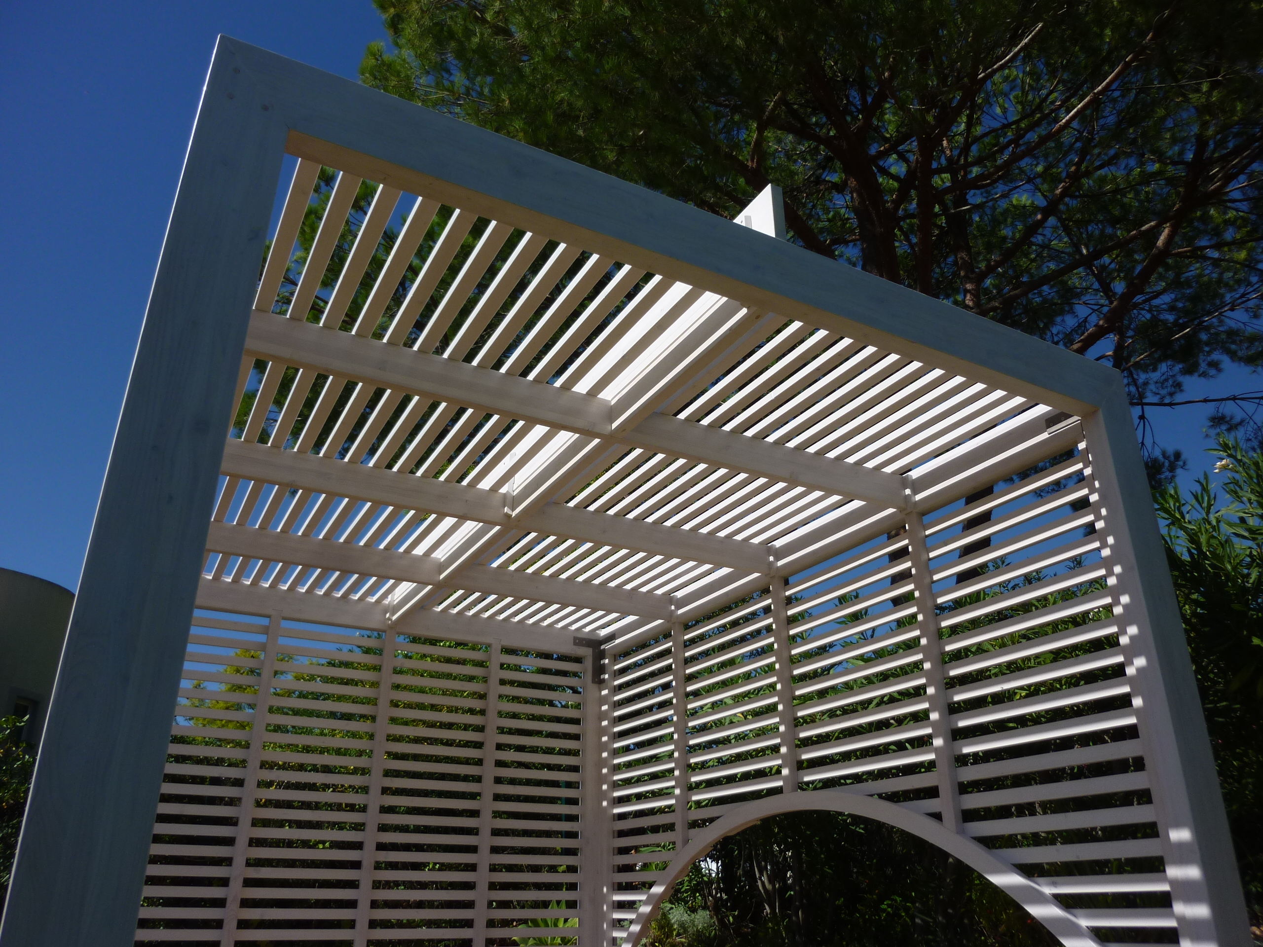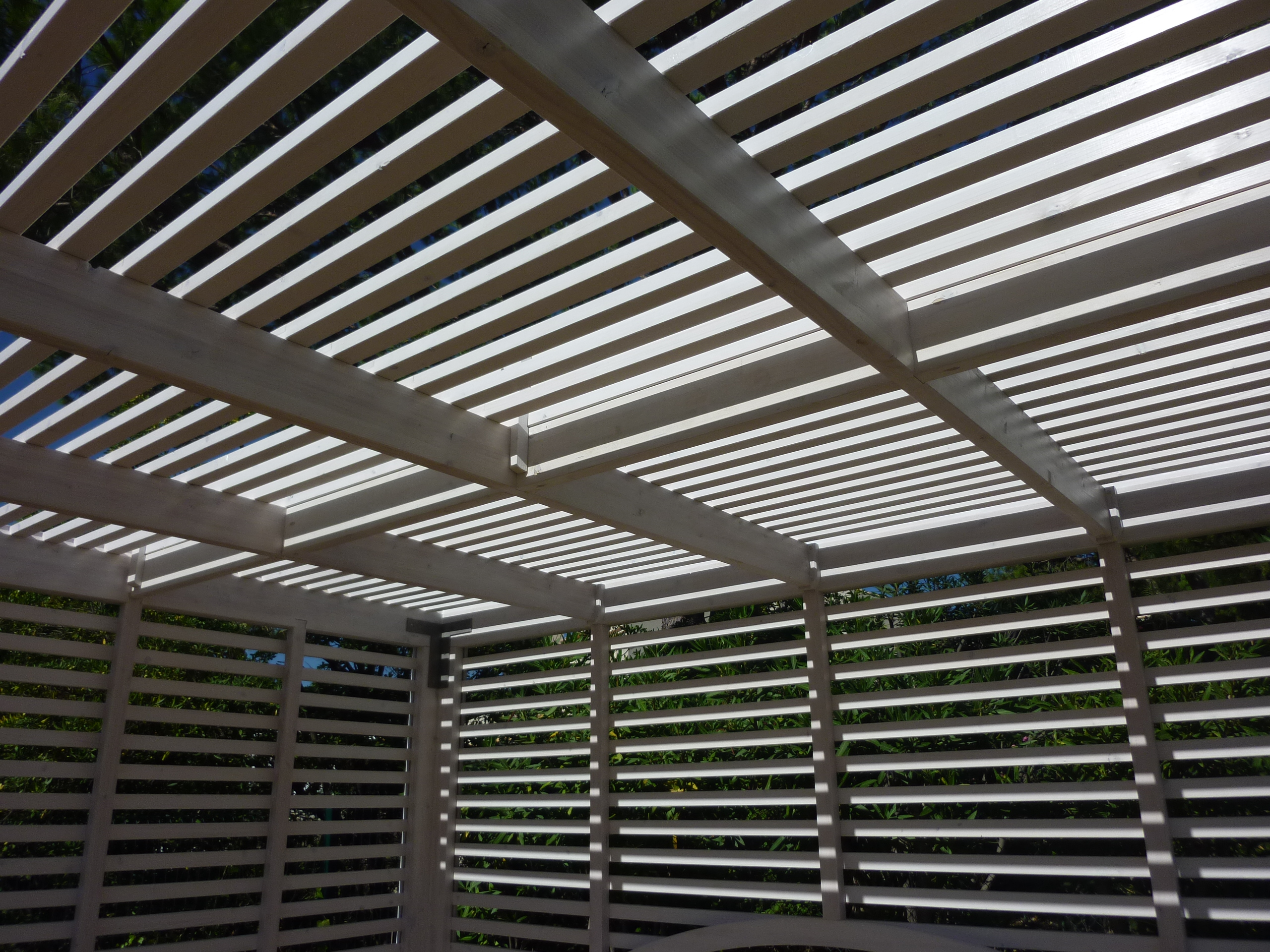 Pergola em ripado de madeira para criação de um ambiente solar controlado num espaço de refeição.